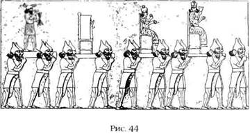Конец этой таблички обломан, однако археологи обнаружили другой текст, в котором, по всей вероятности, описывается эта же церемония отъезда: утренняя трапеза, гимны, рукопожатия. После этого Великих Богов на носилках, напоминающих трон, служители храма доставили в Урук. Одно из ассирийских изображений (хотя и относящееся к более поздним временам) может дать представление о том, как могла выглядеть процессия богов, сопровождавшая Ану и Анту в Урук (рис. 44).