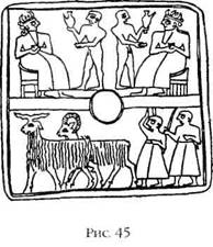 Несмотря на обстоятельства ее знакомства с Энлилем, Нинлиль, став женой главного бога, пользовалась величайшим уважением. Энлиль оставался верен ей – за од-ним-единственным исключением, причиной которого (по нашему мнению) были законы престолонаследия. Найденная в Ниппуре вотивная (обетная) табличка изображает Энлиля и Нинлиль, которым подают еду и напитки в посвященном им храме. Табличка была преподнесена У-Эн-лилем («слугой Энлиля») (рис. 45).