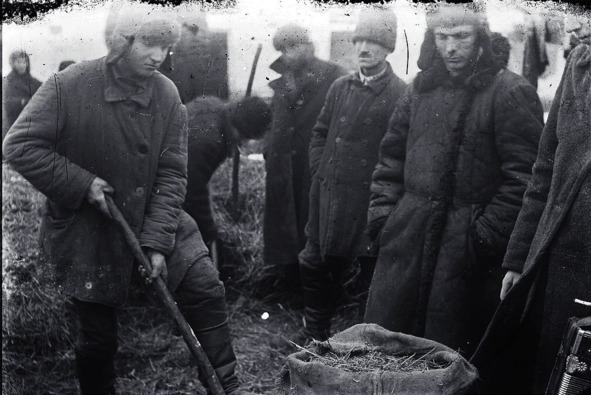 Понятые во дворе крестьянина при поиске хлеба в одном из сел Гришинского района Донецкой области. Автор фотографии неизвестен. Начало 30-х годов XX в.