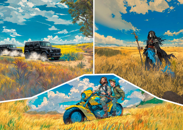 Он отточенным движением схватил ружье и лук, дернул за какой-то трос, и из травы выпрыгнул мотоцикл.