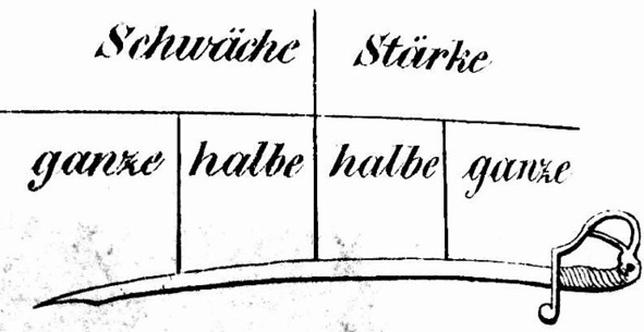 Клинок делится на четыре части (рис. 1): во-первых, на две, сильную (stärke) и слабую (schwäche). Задняя часть от эфеса до середины клинка – сильная, от середины до острия – слабая. В свою очередь, эти половины делятся на две части каждая: на совсем сильную (ganze stärke) и полу-сильную (halbe stärke) и совсем слабую (ganze schwäche) и полу-слабую (halbe schwäche). Половина, прилегающая к эфесу – самая сильная, половина у острия – самая слабая. Это связано с тем, что при парировании самая сильная часть дает самое сильное противодействие, а самая слабая – самое слабое.