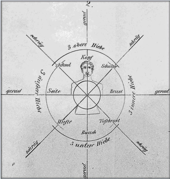 Сторона человека, которая при положении «к бою» прикрыта клинком и лежит от внутренней части его правой руки, называется внутренней стороной, сторона, лежащая по внешнюю сторону от его руки и эфеса сабли – внешней стороной. Следовательно, удары в плечо, грудь и низкий в грудь будут внутренними ударами (innere hiebe), а удары в подмышку, бок и бедро – внешними (äussere hibe). Правая половина лица относится к внешней стороне, левая сторона – к внутренней.