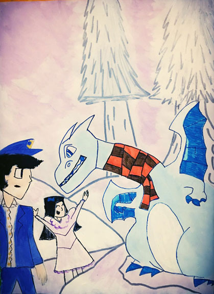 Наконец из-под розовой толщи снега показалась когтистая лапа. За ней ещё одна. А потом Аня и Саша смогли хорошенько разглядеть то, что они приняли за краник – это оказалась голова самого обыкновенного дракона. Не особенно длинная шея была замотана чем-то вроде шарфа со свисающими концами. А на спине топорщились два небольших крылышка.