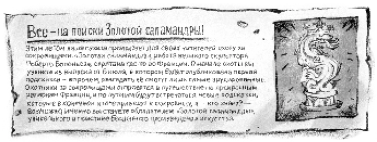 Этим летом наша газета организует для своих читателей охоту за сокровищами. «Золотая саламандра», работа великого скульптора Роберто Болоньезе, спрятана где-то во Франции. О начале охоты вы узнаете из выпуска от 6 июля, в котором будет опубликована первая подсказка – впрочем, разгадать её смогут лишь самые эрудированные. Охотники за сокровищами отправятся в путешествие по прекрасным регионам Франции, и по пути им будут встречаться новые подсказки, которые в конечном итоге приведут к сокровищу, и – кто знает? – возможно, именно вы станете обладателем «Золотой саламандры», уникального и поистине бесценного произведения искусства.
