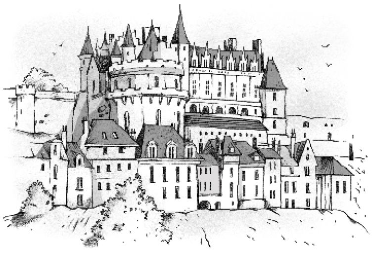 Представьте себе огромную крепость, возвышающуюся над городом: сплошь высокие окна и острые крыши, а по бокам, будто солонка и перечница на подносе со специями, – две высоченные башни. Вокруг зáмка – укрепления и галерея с бойницами у верхнего края крепостной стены, а под стеной – зелёные воды Луары и буйные виноградники повсюду, куда достанет глаз.