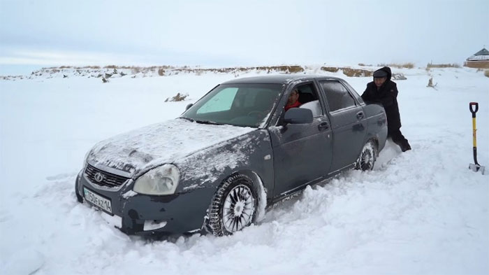 Второй случай вряд ли можно было бы назвать забавным, если бы не обстоятельства, в которых мы его наблюдали. Мы снимали занос машины в снегу, а потом встретили еще одну легковушку, которая стояла посреди ледяных заснеженных просторов. Все разом выкатились из машины помогать владельцу застрявшей машины и попутно снимать происходящее. Это было очень занятно и смешно, потому что парни нашей команды очень оживились, а наш админ все время старательно толкал машину, посматривая в мою сторону, чтобы проверить, снимаю ли я его старания.