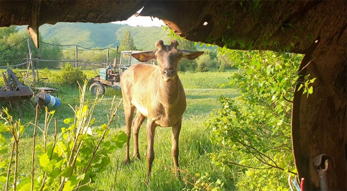 И вот ближе к завершению наших съемок произошла та самая встреча, о которой я упоминала выше. Был вечер, и я вышла прогуляться по территории маральника. Обитающие на ней красивые животные чуют людей и, как правило, держат дистанцию. Я отошла от домиков уже на приличное расстояние, как вдруг услышала шорох. Я повернулась и увидела марала. Он стоял метрах в пятидесяти и жевал, с опаской поглядывая на меня. К слову, марал был в три раза больше меня, не говоря уже о его весе. Я остановилась, чтобы не пугать его. Взяла телефон и стала снимать. Я хотела пройти мимо него и стала спокойным голосом ему это объяснять, но марал меня неправильно понял, и стал подходить ко мне все ближе. Все очарование и милота разом исчезли, и на смену им пришел страх. Я убрала телефон и просто стала ждать. Он подошел ко мне вплотную, и сердце мое в тот момент перестало биться. Я решила не шевелиться, чтобы не спровоцировать агрессию, а он, в свою очередь, наклонился к моей голове и стал жевать мои волосы!!! По всей видимости, через несколько секунд, он понял, что на вкус они ему не нравятся, и прекратил это делать. Потом он отвлекся на чесание своего бока (спасибо щекотавшей его мошке), и в этот момент я посмотрела в сторону и увидела старый ржавый вагончик, куда тут же и запрыгнула.