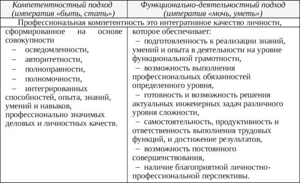 Таблица 1.1. Определение понятия «профессиональная компетентность будущих инженеров» на основании компетентностного и функционально-деятельностного подходов