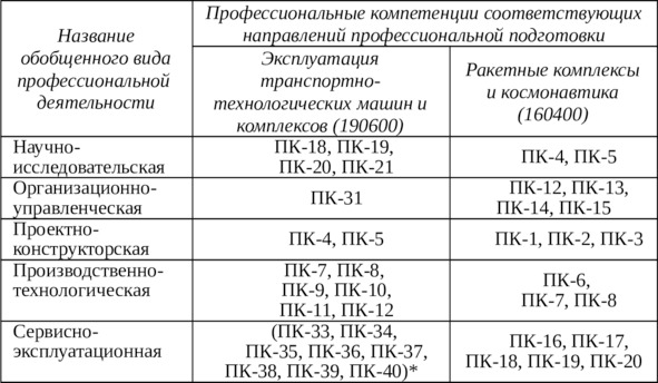Сноска* показывает, что для направления подготовки 190600 —«Эксплуатация транспортно-технологических машин и комплексов» в ФГОС ВПО 2009 г. указанные в таблице профессиональные компетенции, соответствующие сервисно-эксплуатационной деятельности не относятся к компетенциям, формируемым в процессе изучения дисциплин математического и естественнонаучного цикла, и подобные исключения существуют для различных направлений профессиональной подготовки.