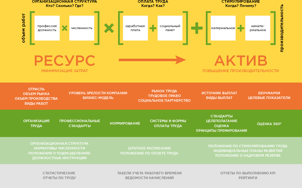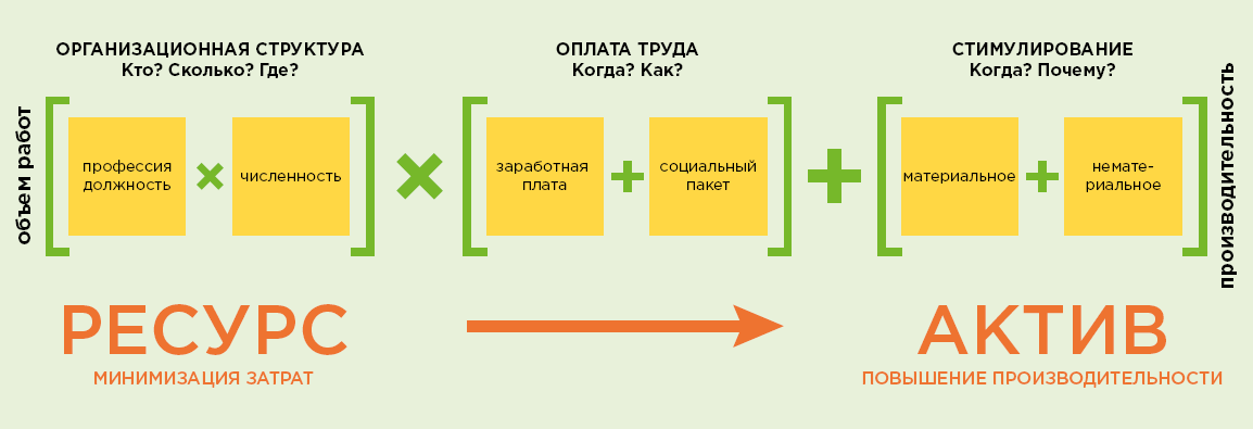 За основу мы взяли разработанную нами систему (условно назвали «Экосистема Ресурс-Труд-Актив»), которая описывает трансформацию труда из ресурса в ценный актив компании.