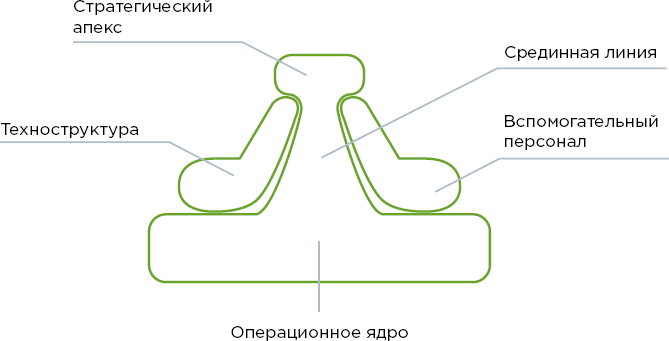 Генри Минцберг в своих исследованиях [2] определил, что любая организация состоит из пяти частей, и по степени влияния на бизнес одной из них выделил пять основных структур: