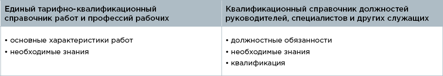В СССР применялся Единый тарифно-квалификационный справочник работ и профессий рабочих (ЕТКС) и Квалификационный справочник должностей руководителей, специалистов и других служащих (КС).