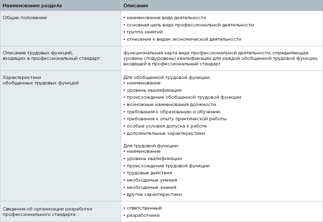 Таблица 16. Структура Профессионального стандарта, принятого в РФ [9]