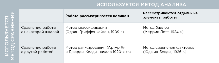 Для оценки сложности работа сравнивается либо с некоторой шкалой, либо с другой работой. При этом работа может рассматриваться целиком или только отдельные ее элементы. В Таблице 17 представлены ведущие методы оценки сложности работы.