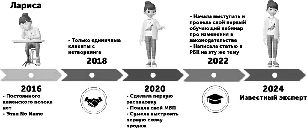 Личный бренд для экспертов-фрилансеров и предпринимателей (руководителей и собственников малого бизнеса)Например, жила-была юрист Лариса. В точке А у нее отсутствие постоянного потока клиентов и, как следствие, денег на развитие бизнеса. В результате проработок личного бренда Лариса теперь – известный юрист, и это дало ей возможность работать по новому чеку.