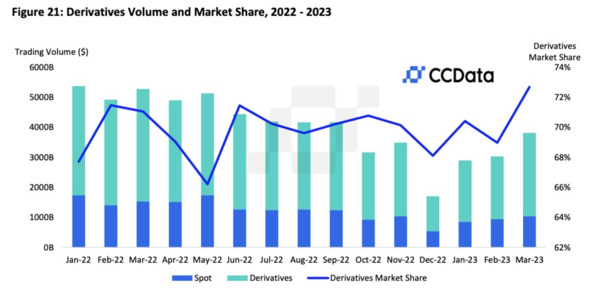 Рисунок 4 Объем торговли и доля деривативов в нем за 202—2023 гг.