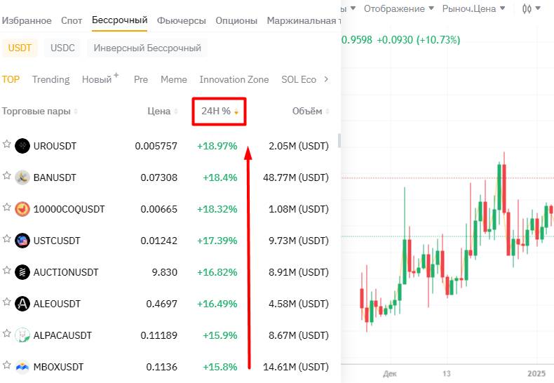 Рисунок 2 Рост альткоинов в процентах за 24 часа
