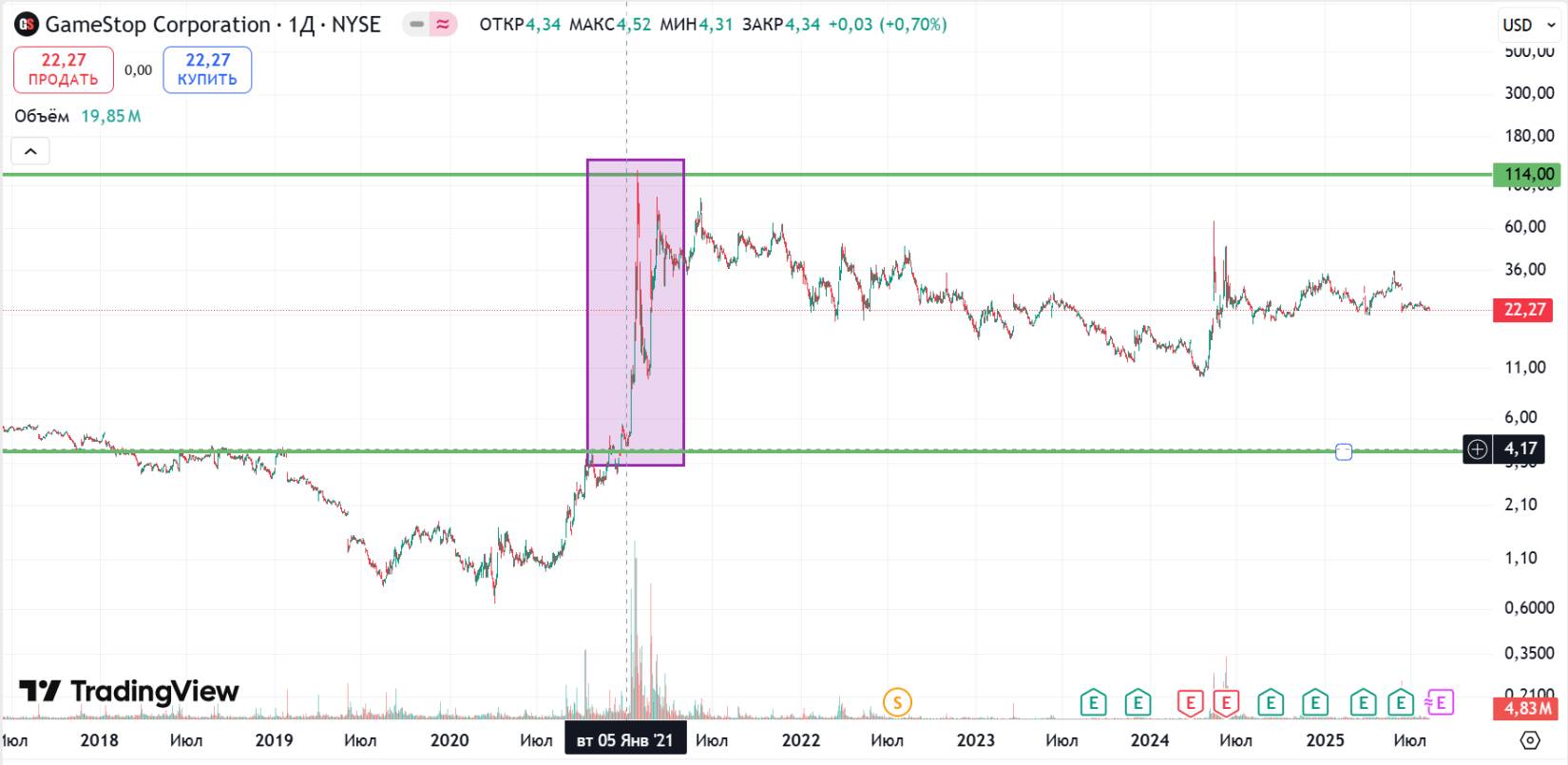 Рисунок 7 Взлет акций GameStop в начале 2021 года