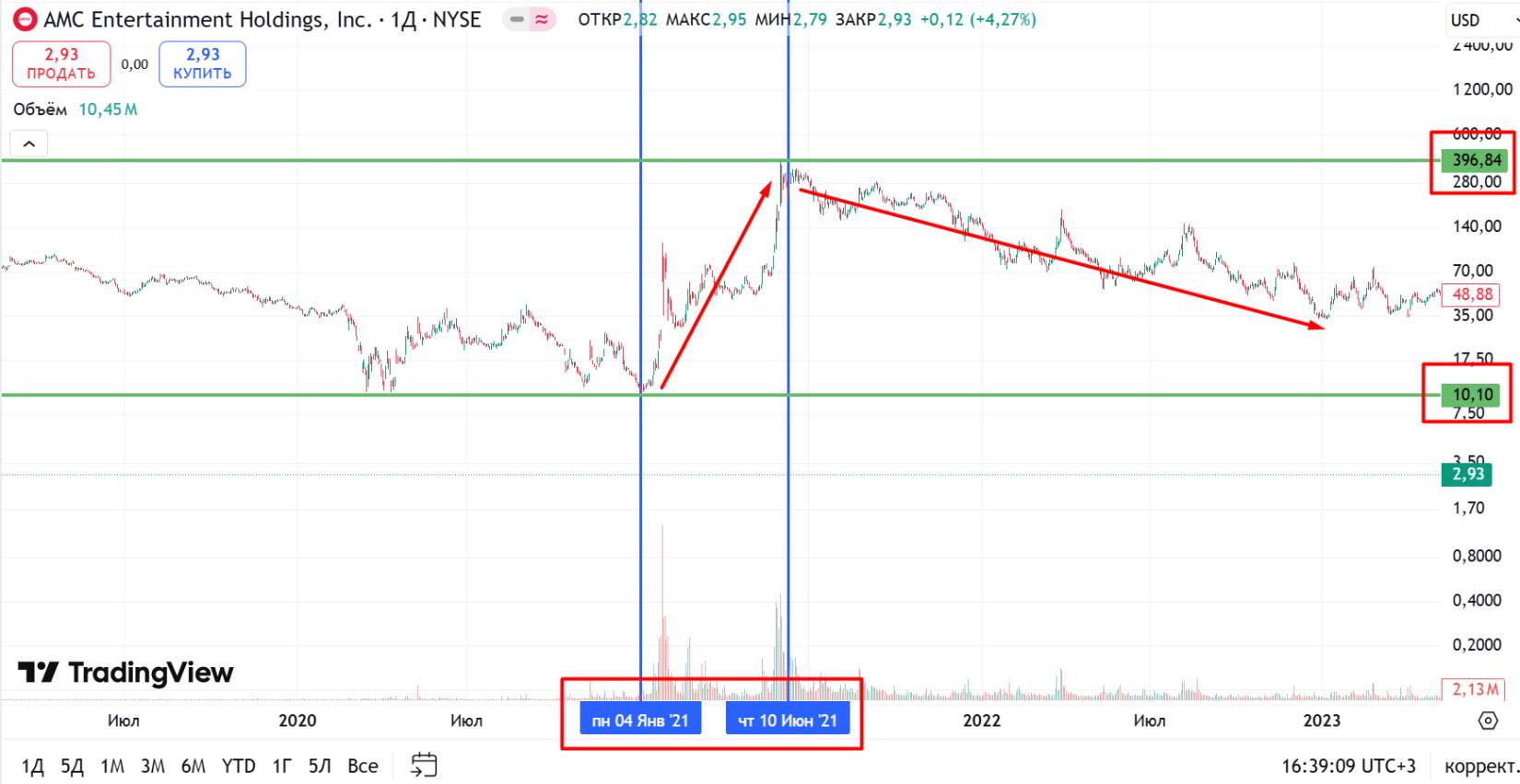 Рисунок 9 График роста AMC с $10 до почти $400 за полгода перед обвалом