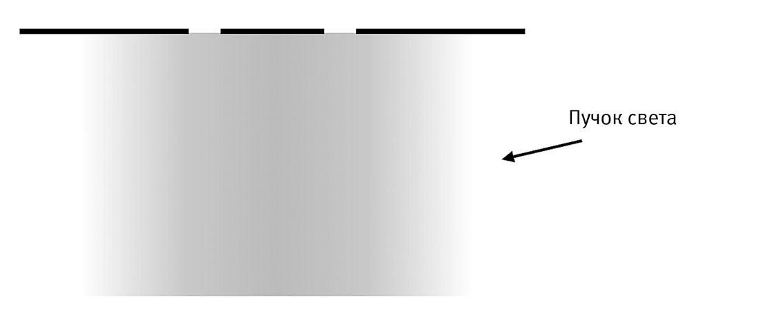 Затем он направил на экран пучок света. Пучок был достаточно широким, чтобы пройти сквозь обе щели: