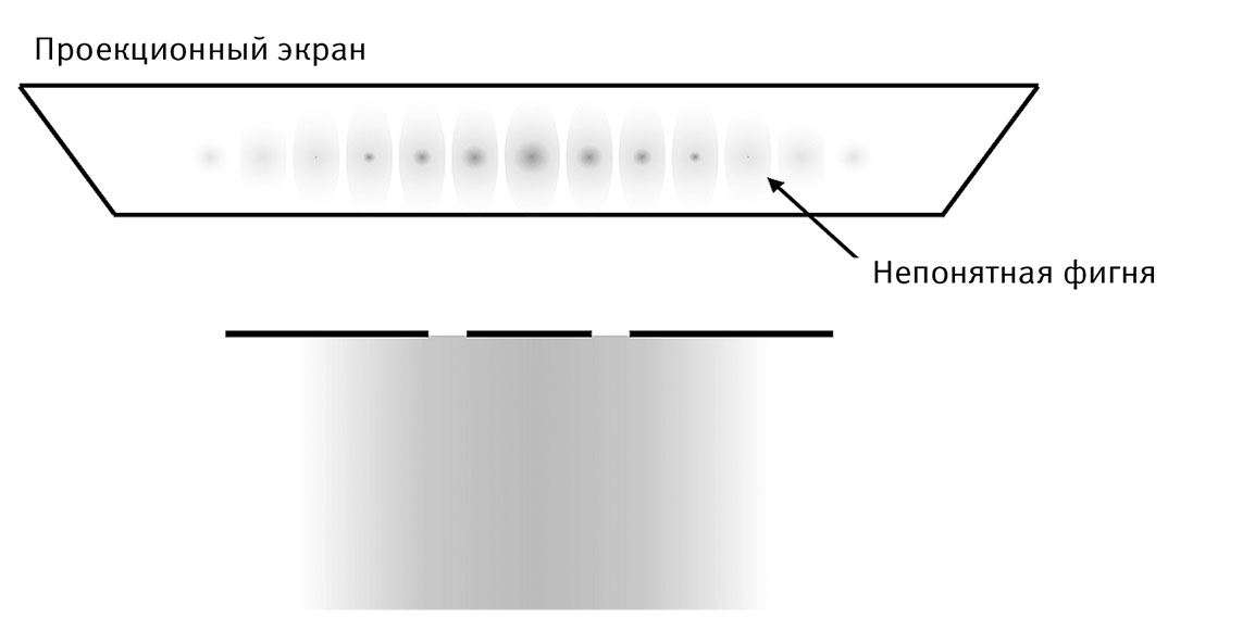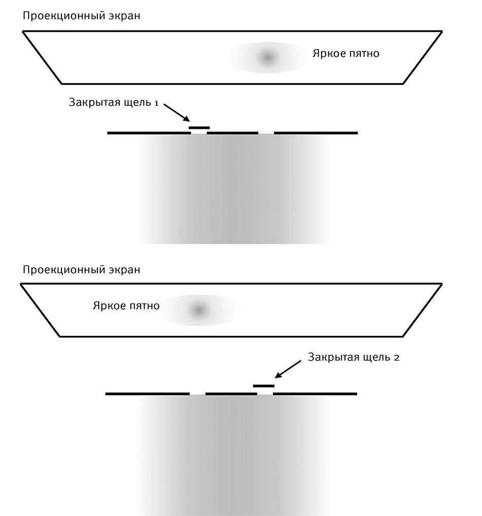 Дайте угадаю. Скорее всего, вы думаете: «Какая чушь. Я получаю яркое пятно справа на проекционном экране, если открыта правая щель, и яркое пятно слева на проекционном экране, если открыта левая щель. Значит, если открыты обе, ясно, что я увижу два ярких пятна, одно справа и одно слева».