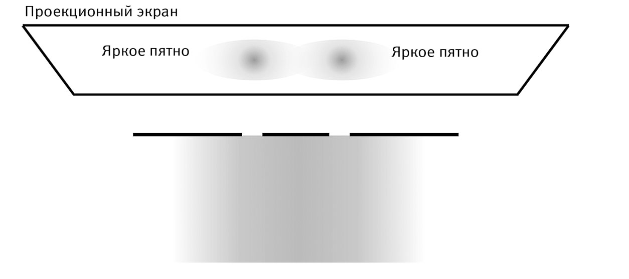 Результат отнюдь не поражал: Юнг увидел на проекционном экране одно яркое пятно именно там, куда и должен был попасть свет после прохождения через правую щель. И тот же результат Юнг получил, когда перекрыл, наоборот, правую щель: опять яркое пятно именно там, где его следовало ожидать, раз он прошел через левую щель (рис. внизу).