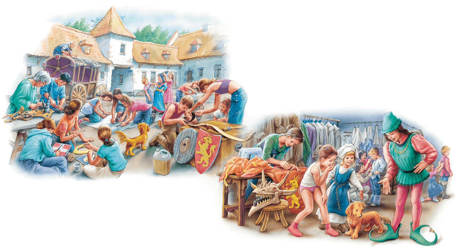 Приготовления идут полным ходом. Дел хватает и взрослым, и детям. Дошивают плащи и платья, докрашивают гербы и щиты. Многие даже поменяли профессию. Мой дедушка, инженер на пенсии, стал каретным мастером, школьный учитель с сыном украшают конскую упряжь, студенты мастерят деревянный лук. А костюмов, костюмов-то сколько надо сшить: для всех жителей, больших и маленьких!