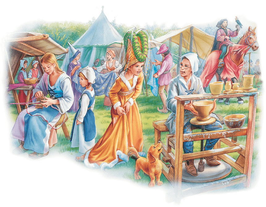 Девушка в крестьянском платье прядёт пряжу. Как ловко снуют её пальцы! А чуть дальше продают ткани, расшитые цветами, гербами, драконами.