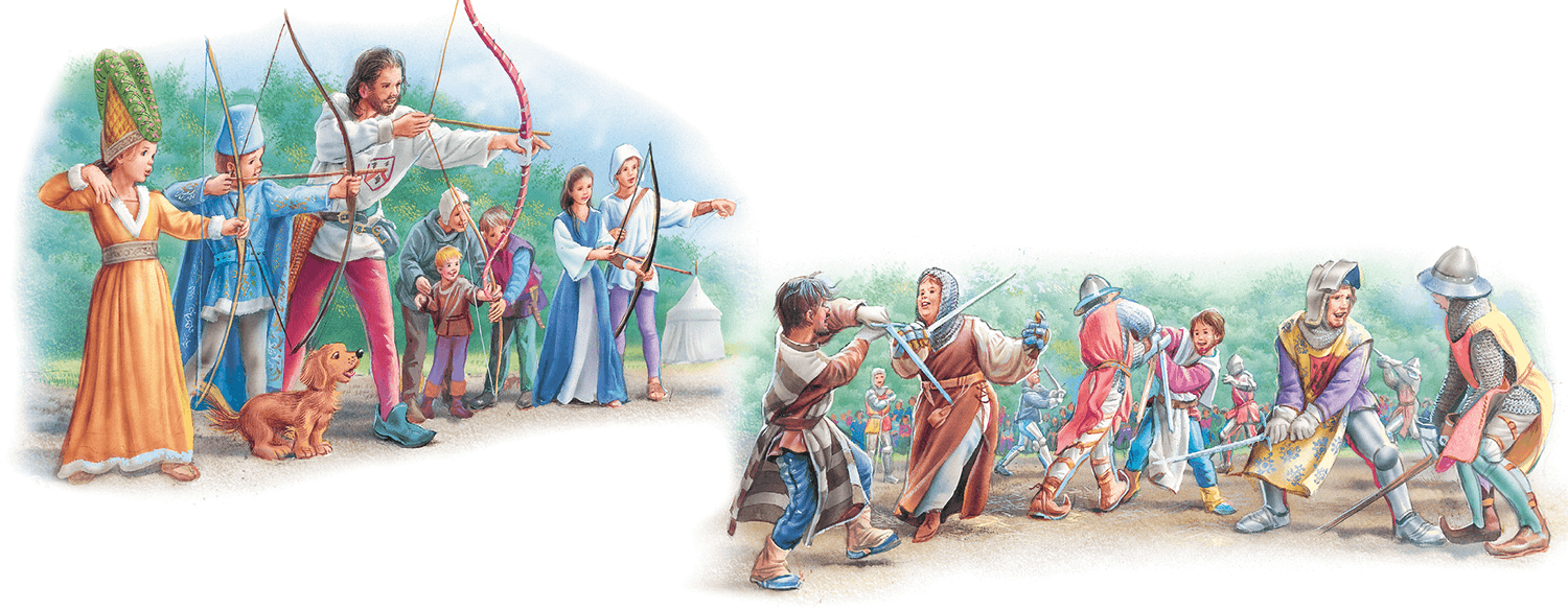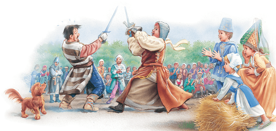 На другой поляне сражались на мечах. Бои, конечно, были шуточные, но звон стоял, как на настоящем поле битвы.