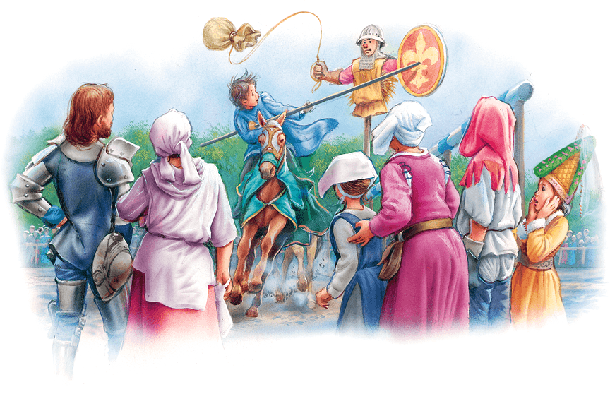 На высоком шесте я увидела соломенного воина. Это и было чучело, с которым Костя и другие участники карнавала собирались сражаться. В одной руке у воина щит, в другой – тяжёлый мешок на верёвке. Нужно на полном скаку попасть копьём в середину щита.