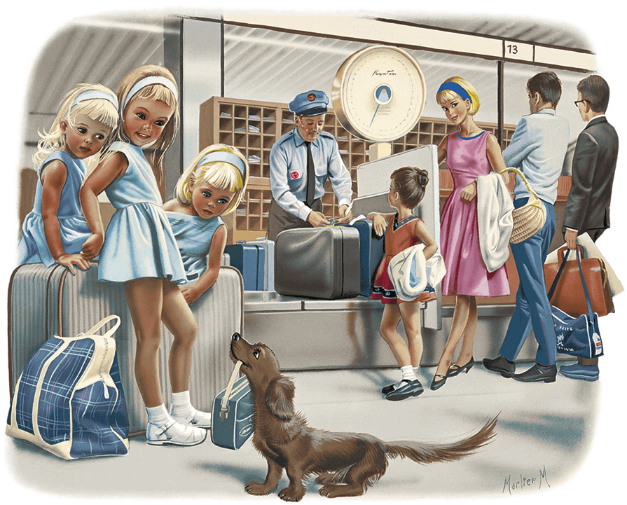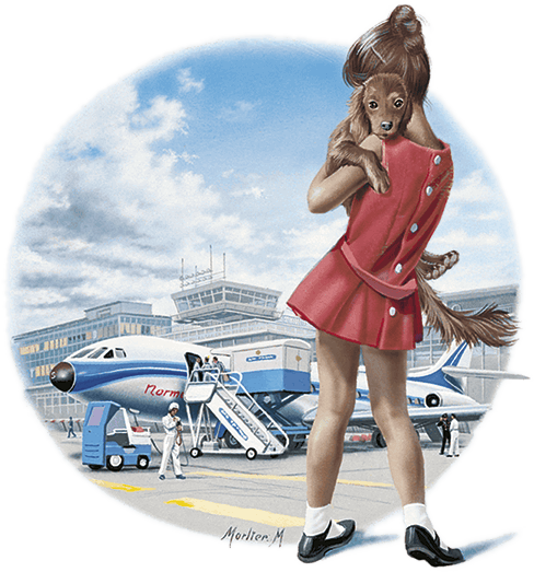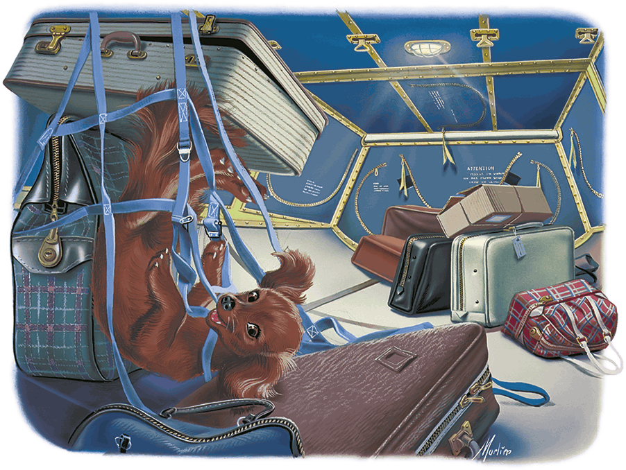 Ну да, вы угадали – это Таксик. Он прикатил на вагонетке с чемоданами и, пока грузчики перекладывали их в самолёт, незаметно запрыгнул туда и спрятался в уголке.