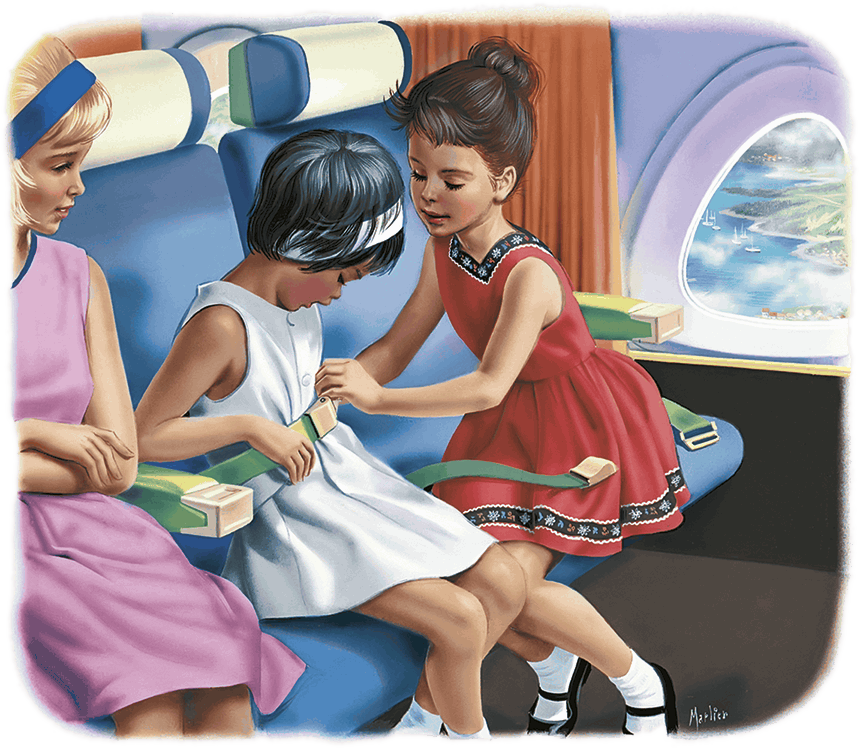 – Лайнер – это воздушное судно, то есть самолёт, – объясняет она. – А экипаж – его команда. Командир, второй пилот и стюардессы. Пилоты сидят в кабине, в передней части лайнера. Командир держит штурвал, управляет самолётом. Второй пилот следит за приборами, которые показывают высоту и скорость полёта, переговаривается с диспетчером. Ну, а стюардессы работают в пассажирском салоне: разносят еду и питьё, могут, если понадобится, принести лекарство, одеяло, ответить на любые вопросы.