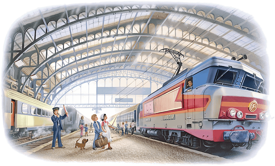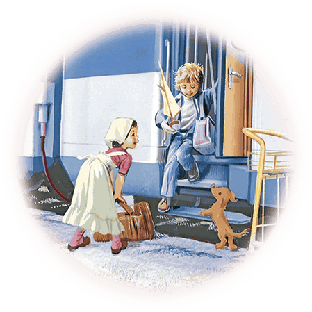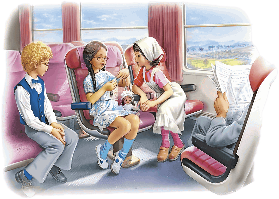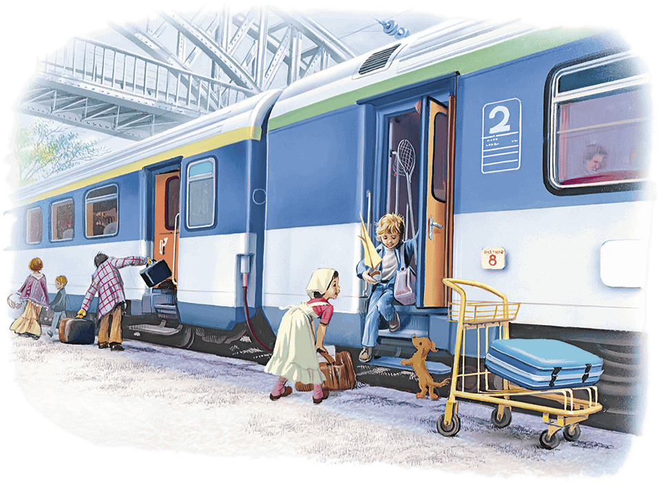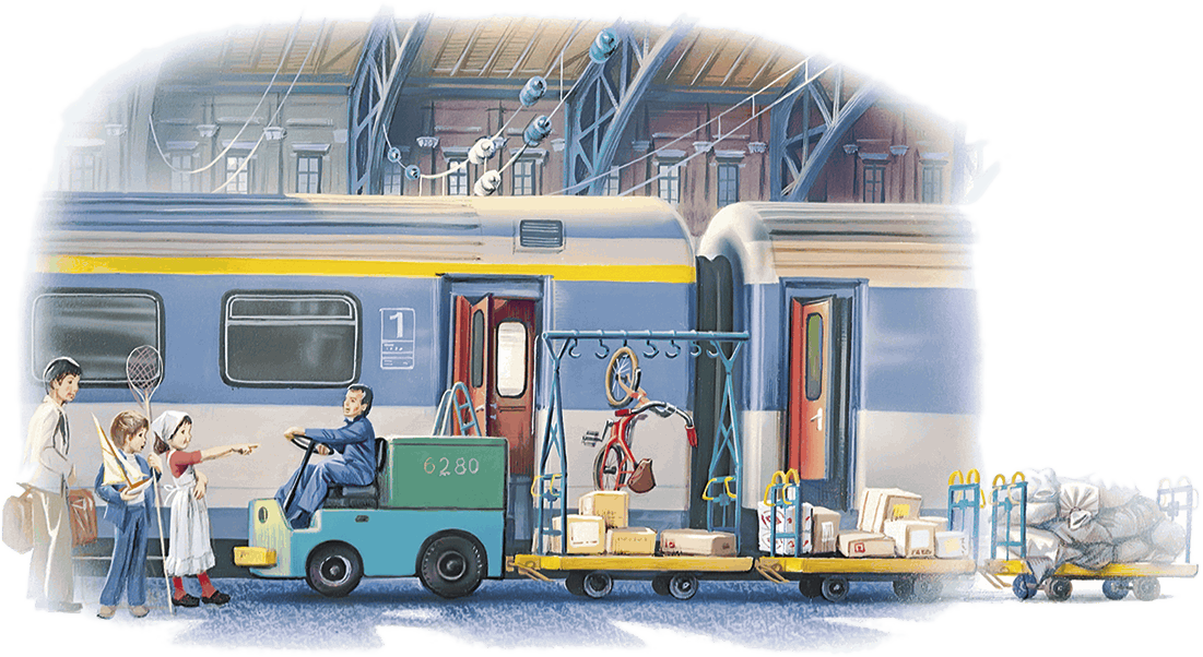 – Ты только посмотри, Маруся, какой силач этот локомотив! Он помчит нас быстрее, чем автомобиль.