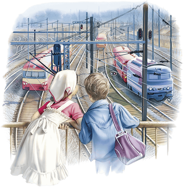 Что ж, пойдём по мосту. Так даже интереснее. Оттуда, сверху, видно, как расходятся в разные стороны рельсы, как подъезжают поезда. Вот стрелки, чтобы направлять их, куда нужно. Вот светофоры – показывают машинисту, когда ждать, а когда двигаться вперёд.