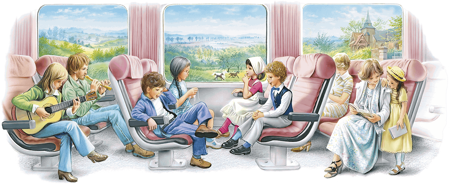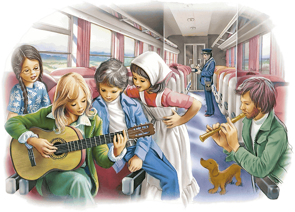В нашем вагоне едут молодые музыканты. У девушки гитара, а у парня флейта. Они так чудесно играют! Даже Таксик заслушался.