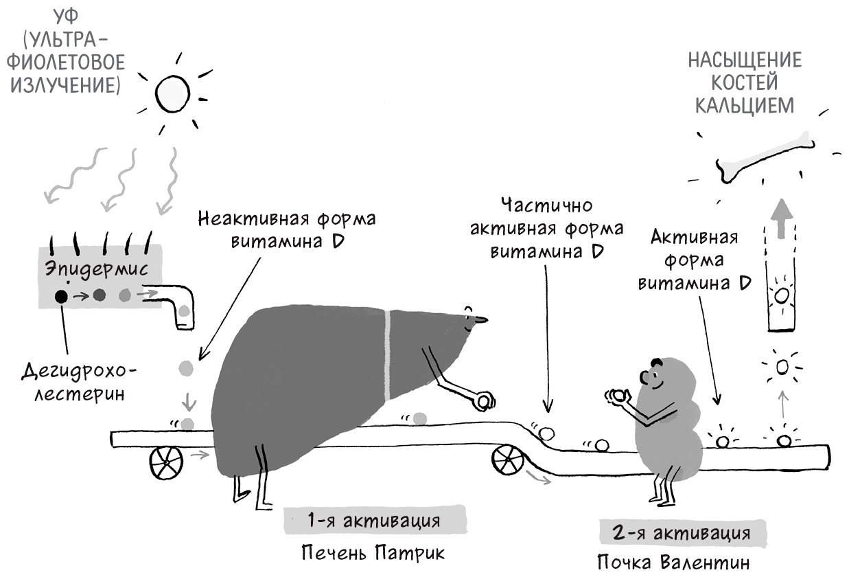Вместе с Патриком мы активируем витамин D, обеспечивающий минерализацию костей. Поэтому, если мы заболеем из-за агрессивного воздействия, например, сахарного диабета или гипертонии – это называется почечной недостаточностью, – наш человек должен будет получать витамин D извне, чтобы его кости не утратили весь кальций и не переломались.