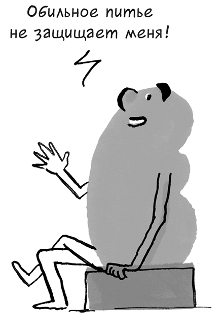 Здесь научные данные тоже однозначны: мне жаль вас расстраивать, но призыв «Пейте, выводите!» не избавит вас от отходов жизнедеятельности, не поможет похудеть и, коротко говоря, не окажет никакого эффекта на ваше здоровье[28]. Это лишь рекламный слоган, придуманный для того, чтобы продать больше минеральной воды. Вполне достаточно пить столько, сколько хочется. Остальное окажется в туалете, затем в реках и грунтовых водах, где это можно будет снова собрать, чтобы продать в бутылке с водой. Это то, что называют «замкнутым кругом»… для производителей.