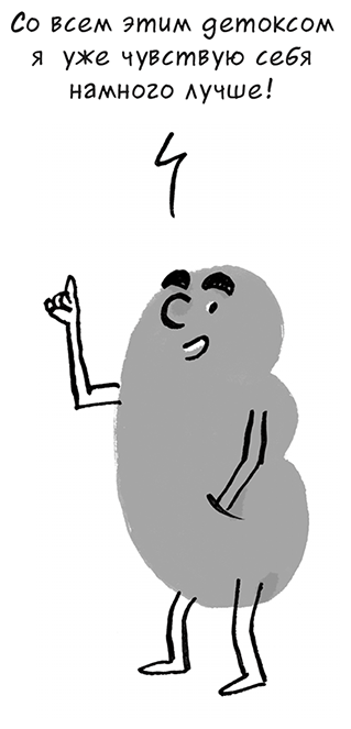 Один стакан фруктового или овощного детокс-сока стоит столько же, сколько два килограмма свежих фруктов, при этом сок гораздо менее полезен, чем фрукты и овощи, которые мы съедаем целиком. Соки из экологически чистых фруктов без пестицидов слишком дороги, поэтому, когда мой человек уступил соблазну псевдодиеты, мне пришлось выводить с мочой пестициды из этого фруктового суррогата! Я в бешенстве!