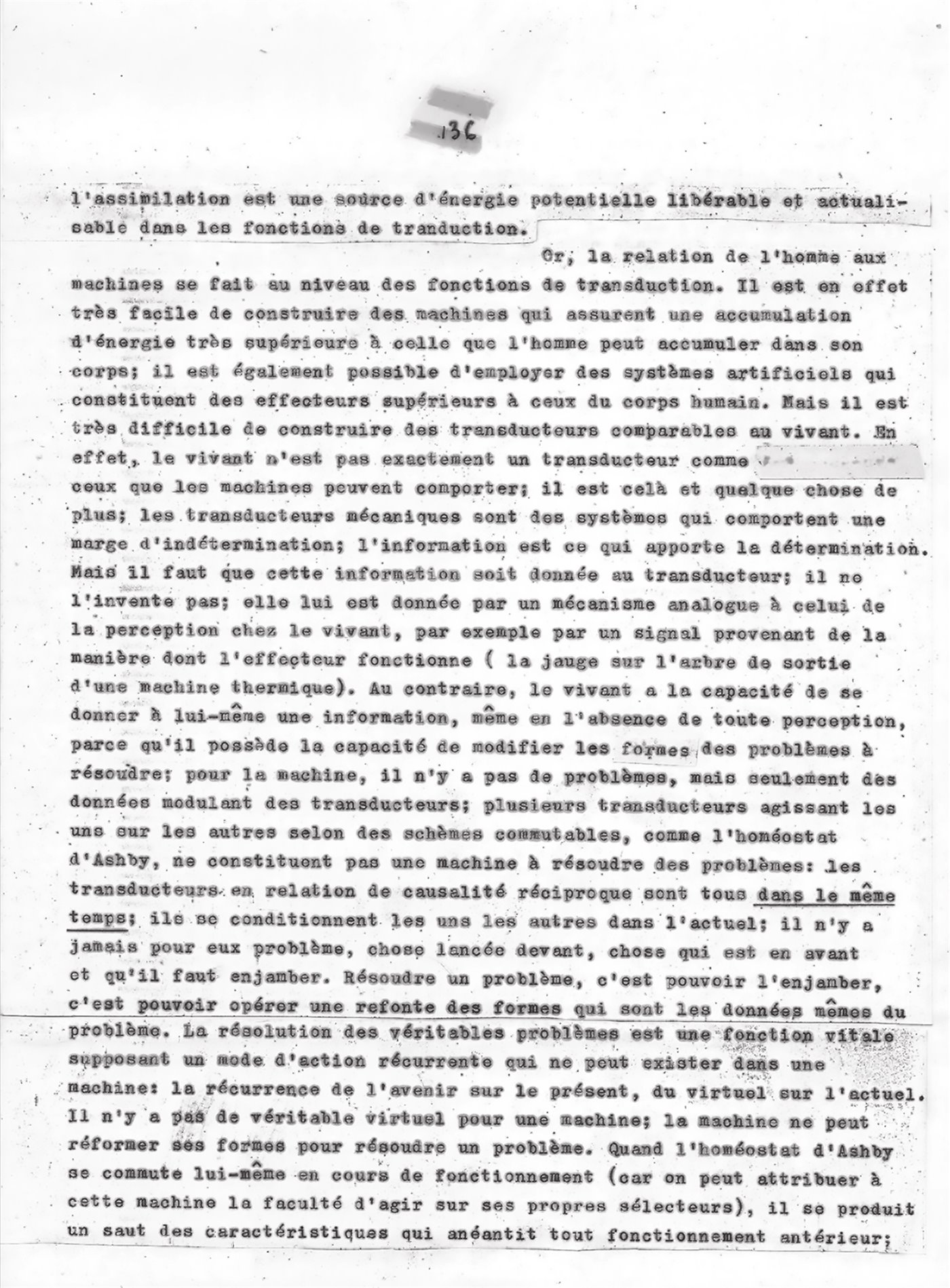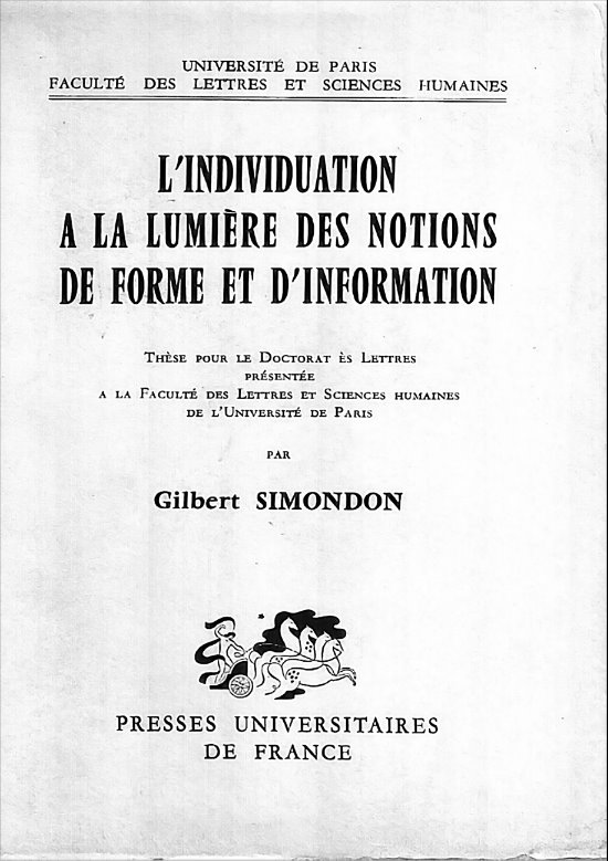 Жильбер Симондон родился в 1924 году в Сент-Этьене – промышленном городе, расположенном в Центральном массиве. Несмотря на скромное происхождение – его отец служил начальником почты, а мать была родом из крестьянской семьи – он получил отличный аттестат о среднем образовании и в 1944 году успешно сдал вступительные экзамены в Высшую нормальную школу на улице Ульм1, а в 1948 году прошёл конкурс на должность преподавателя философии. Кроме того, в 1950 году он получил диплом бакалавра по психологии, слушал лекции по психофизиологии и медицине и одновременно преподавал философию в турском2 лицее, а также готовился к соисканию учёной степени доктора наук, для чего в ту пору требовалось написать две докторские диссертации: основную и дополнительную. В 1958 году Симондон защитил основную докторскую диссертацию «Индивидуация в свете понятий формы и информации», написанную под руководством Жана Ипполита, знаменитого переводчика и комментатора Гегеля, а также дополнительную диссертацию «О способе существования технических объектов», научным руководителем которой был эпистемолог Жорж Кангилем.