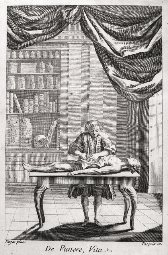 1. Резцовая гравюра «De funere, vita», изображающая сцену вскрытия тела человека. Автор этой гравюры, Паскье, создал ее для труда Пьера Баррера «Анатомические наблюдения, основанные на вскрытии множества трупов» (Observations anatomiques tirées des ouvertures d’un grand nombre de cadavers. Perpignan: Reynier, 1753)