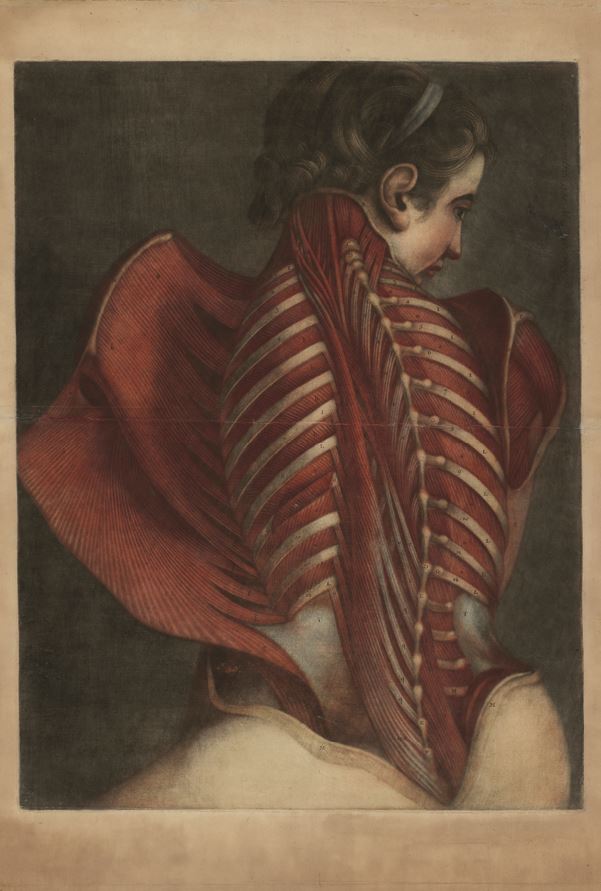 3. «Анатомический ангел». Жан-Батист Андре Готье-Даготи, 1745 г. Отдельная иллюстрация строения мышц, изображающая в цвете и в натуральную величину женское тело, вскрытое от затылка до крестцовой кости