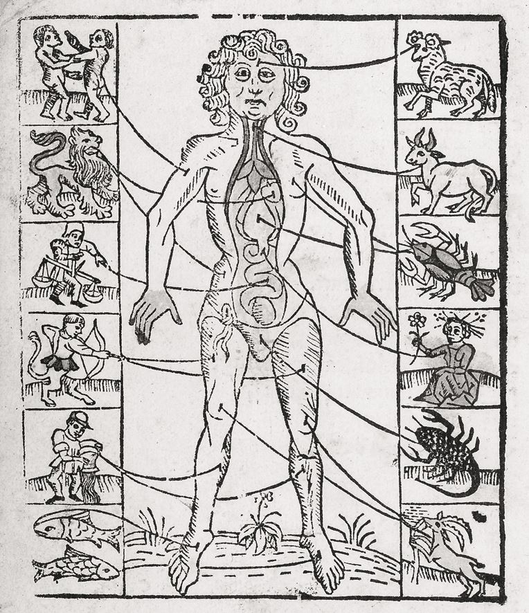 В числе средневековых изображений человеческого тела встречаются также «мелотезические / зодиакальные люди». Мелотезией называется представление о связи звезд и органов, а также о влиянии небесных тел на организм. Какой бы странной ни казалась эта идея, она получила большое распространение сначала на Востоке, а затем и на Западе. Зрительно эта идея представлена в изображении homo signorum – человека, каждой части тела которого соответствовал тот или иной знак зодиака. Некоторые авторы той эпохи демонстрируют связь астрологии с медициной, изображая их аллегории вместе. Стиль таких изображений значительно отличается в зависимости от времени и места создания, как и в случае с другими видами искусства.