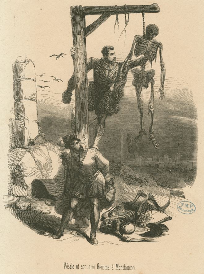 5. Везалий и его друг Гемма у виселицы Монфокон в Париже. В период своего обучения в Париже Везалий жил напротив эшафота, где мог наблюдать за будущими объектами вскрытия