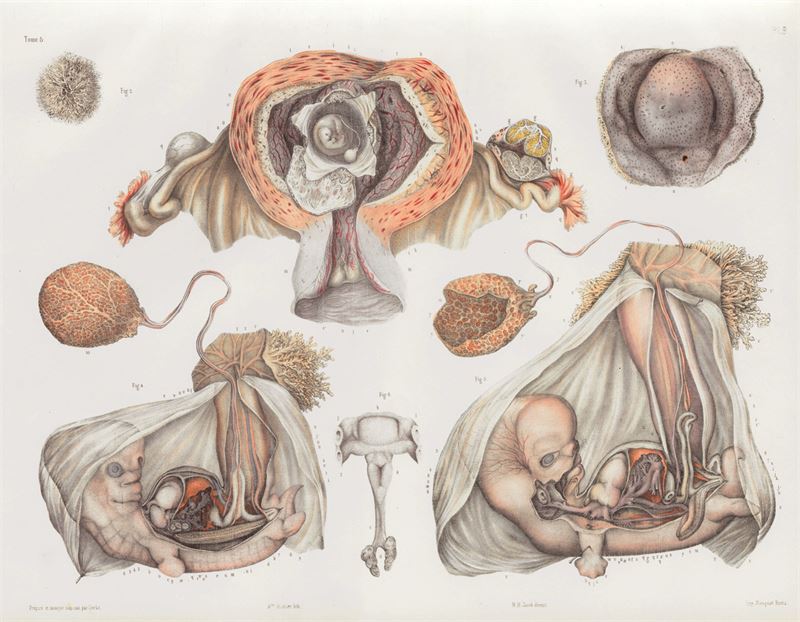 8. Развитие человеческого эмбриона. Иллюстрация из 8-го тома «Полного трактата о человеческой анатомии» (Traité complet de l’anatomiede l’homme, Paris, 1866–1871), авторы д-р Жан-Марк Буржери, д-р Клод Бернар и преподаватель, иллюстратор-анатомист Н. Г. Жакоб при участии Людовика Хиршфельда