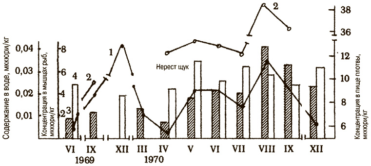 Рис. 2. Содержание Cs137в воде водоема (1) и его концентрация в пище плотвы (2) и мышцах плотвы (3) и щуки (4) [11].