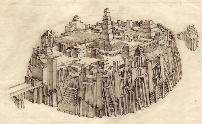 Столицу Посейдонис, получившую имя в честь бога морей и землетрясений Посейдона, окружали стены, покрытые сверкающей медью. Внутри имелось еще три стены, огораживавшие обширные публичные площади, от которых отходили улицы и каналы. Последняя стена была покрыта орихалком, загадочным металлом, который блестел, как золото (быть может, речь шла о бронзе?). Эта стена окружала храм Посейдона, возведенный на горе и превосходивший все остальные памятники своим великолепием. Внутри храма у позолоченных стен стояли скульптуры из слоновой кости и золота, и самой колоссальной была статуя Посейдона, который правил шестеркой крылатых коней. Никому под страхом смерти не позволялось входить в храм без разрешения жрецов, денно и нощно его охранявших.