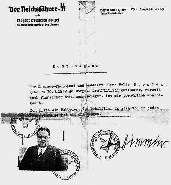 ПодтверждениеМассажист-терапевт и агроном, господин Феликс Керстен, рожденный 30.09.1898 в Дорпате, изначально немецкий, в настоящее время еще и финский гражданин, знаком мне лично. Я прошу соответствующие органы оказать ему помощь и обращаться ко мне в случае всех сомнений.