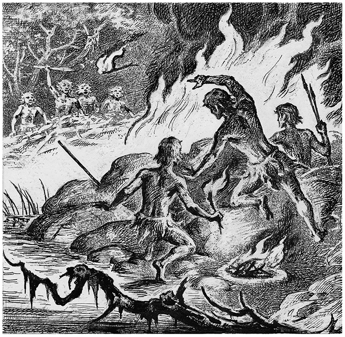 Изумленные странными действиями врагов, рыжие карлики метнули наугад несколько дротиков, но не попали в цель. Когда же они наконец догадались, что затеял Нао, было уже поздно: высокие языки пламени лизали сухую листву и ветви их укрепления. Еще минута, и все оно превратилось в гигантский пылающий костер.