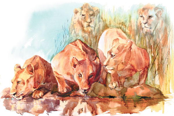 Вдруг страх овладел всеми животными; затрепетав, они огромными прыжками унеслись прочь. Пять львов спускались к водопою.