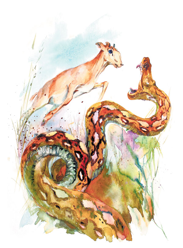 Дрожа от ужаса, сайга бросила тоскливый взгляд на простиравшуюся перед ней зелёную равнину. Всего лишь два удачных прыжка – и она спасена! Заметавшись, сайга сделала безуспешную попытку проскочить мимо питона по самому краю обрыва и вдруг, отчаявшись, огромным скачком перемахнула через препятствие…
